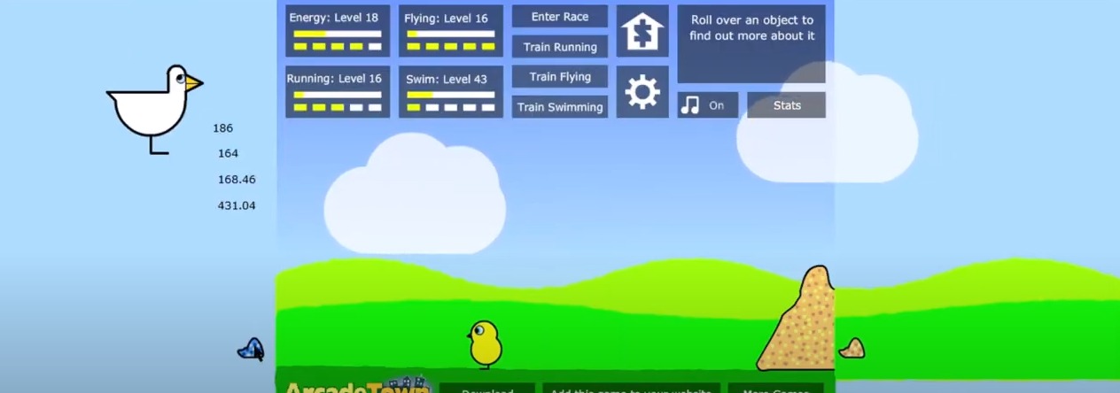 Regular seeds, which cost one coin, will only increase the duck's energy, which is needed to make it through longer races. Skill seeds, on the other hand, which cost ten coins, will increase all three of the duck's skills alongside its energy. Seeds are essential because lacking energy will result in the duck passing out during a race, leading to an automatic loss. However, at the start of the game, the game provides the player 5 free seeds, which will level their duck up to level 2.6 if the entire mound is consumed.